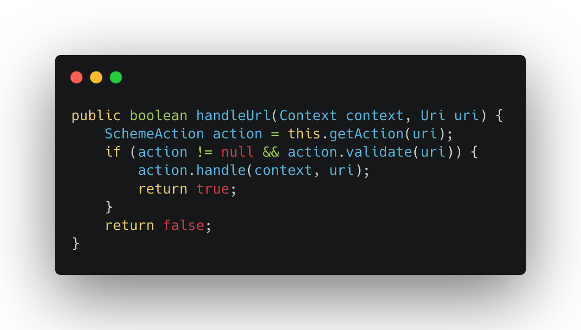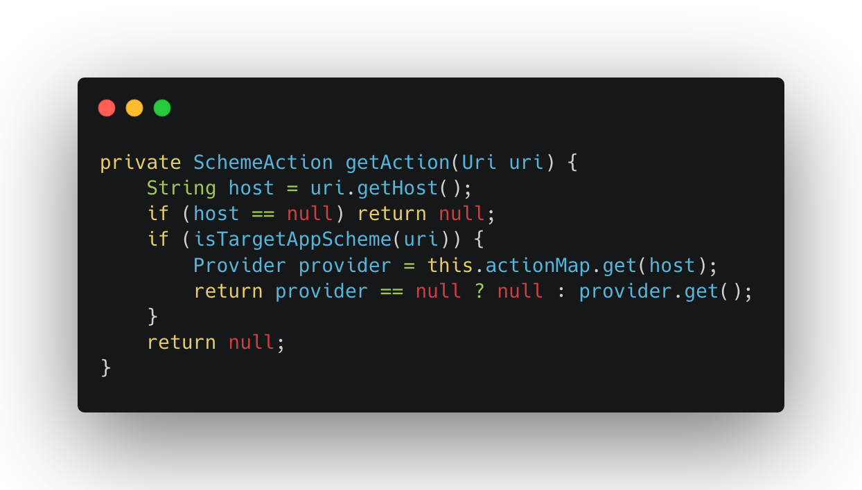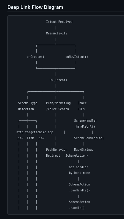 Inside MainActivity, deeplinks with the targetapp:// scheme are passed to a scheme router. Here’s the simplified flow: