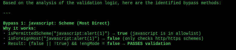 This returned a couple of handlers, which is a significant decrease in the number of handlers to look for, but of course it doesn’t stop here, i asked it to go through each one of these handlers, understand how does it process it’s arguments, how does it lead up to the webview, and to look for any URL validation along the way.