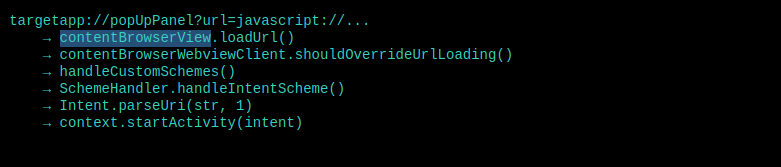 When the WebView navigates to an intent:// URL, the app parses it with Intent.parseUri() and fires the resulting intent. This means our JavaScript can trigger any intent within the app — a gateway opens to internal activities.