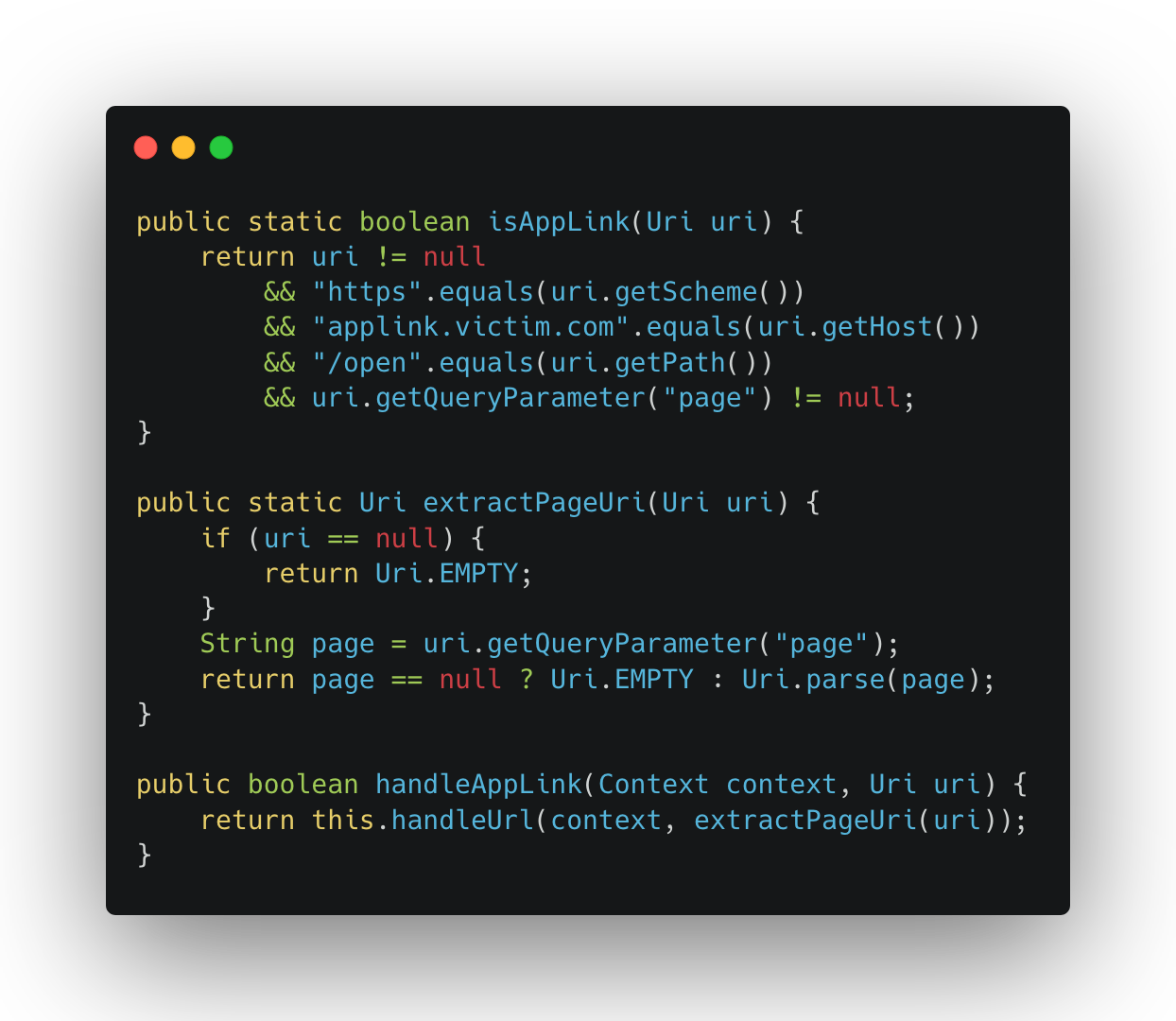 I went back and looked at how the app handles these applink URLs. Turns out, when MainActivity receives a URL matching https://applink.victim.com/open, it extracts the page query parameter and feeds it straight into the same scheme router: