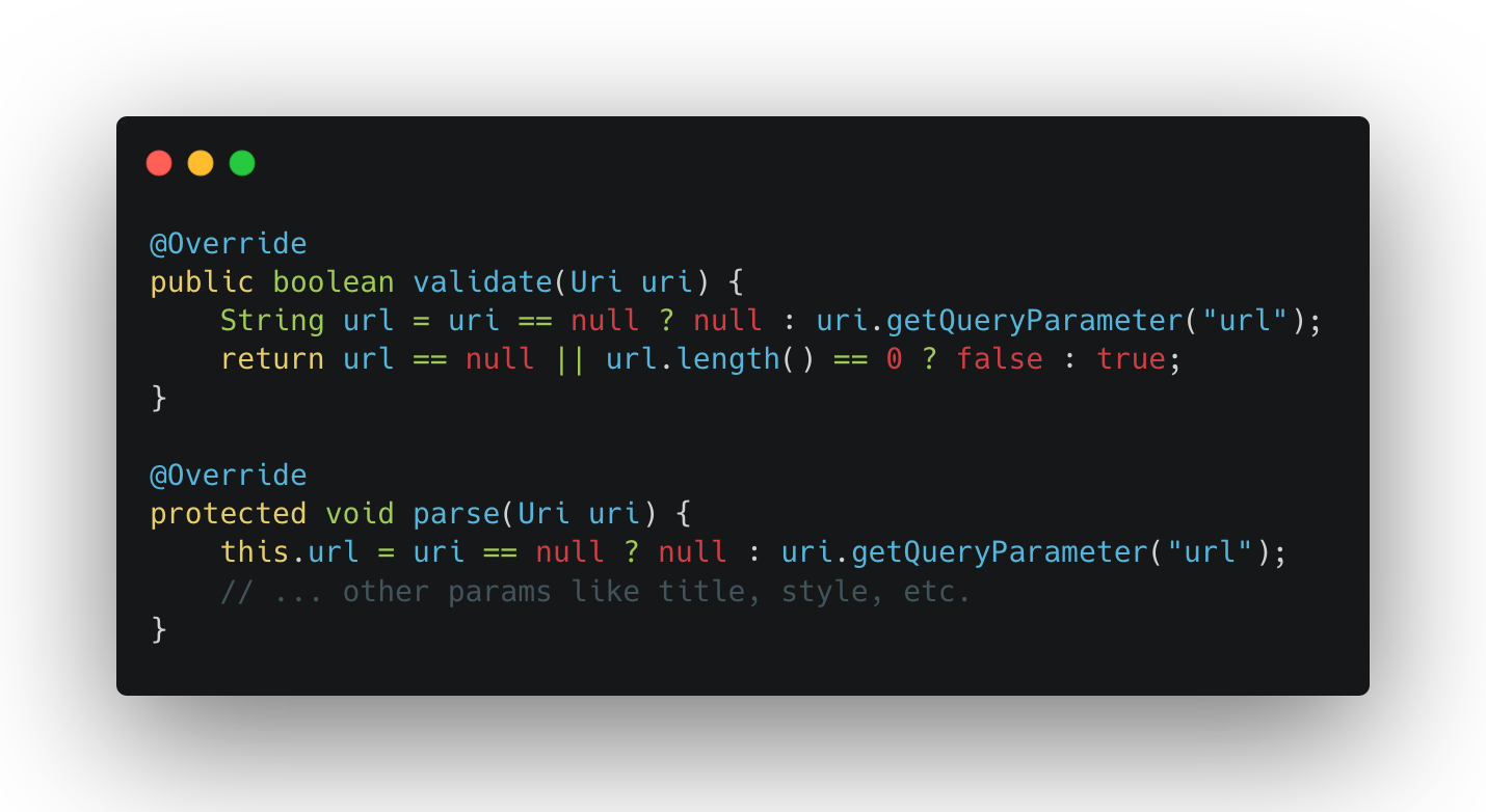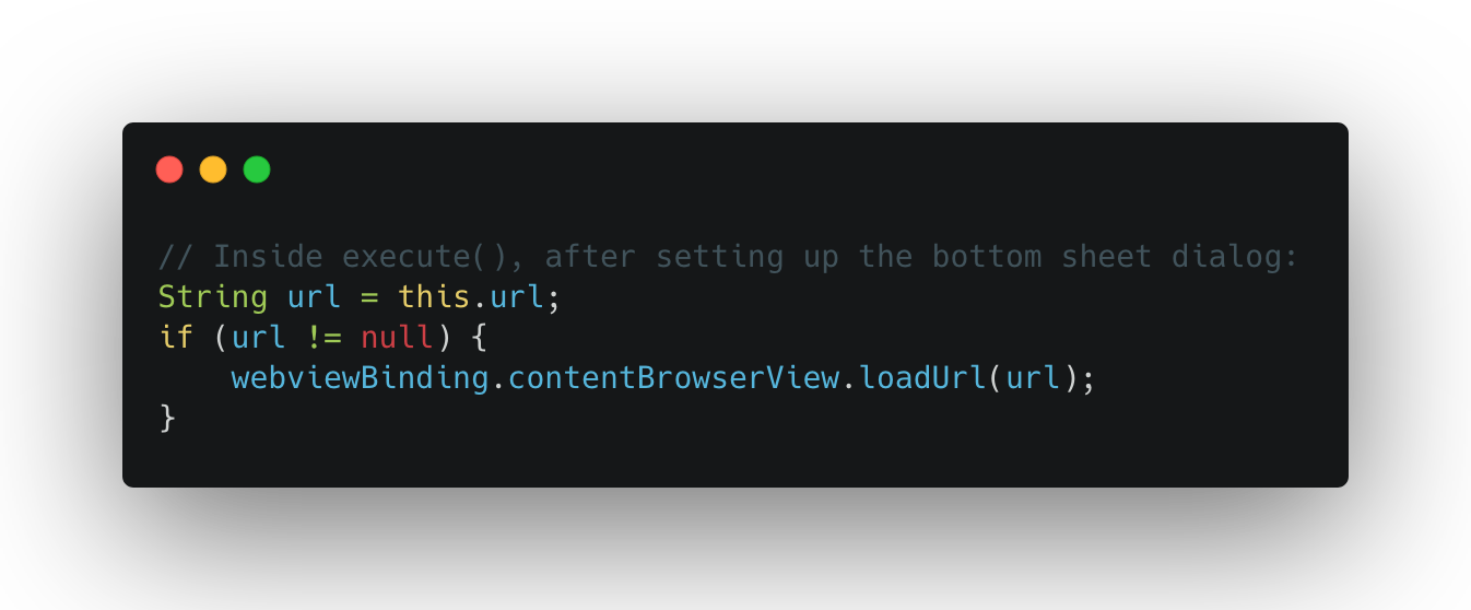 Nothing surprising here — the handler just grabs the url query parameter and forwards it. It’s not the handler’s job to validate the URL itself, that responsibility falls on the component that actually loads it. In the execute() method, the handler sets up a bottom sheet dialog and passes the URL to the WebView: