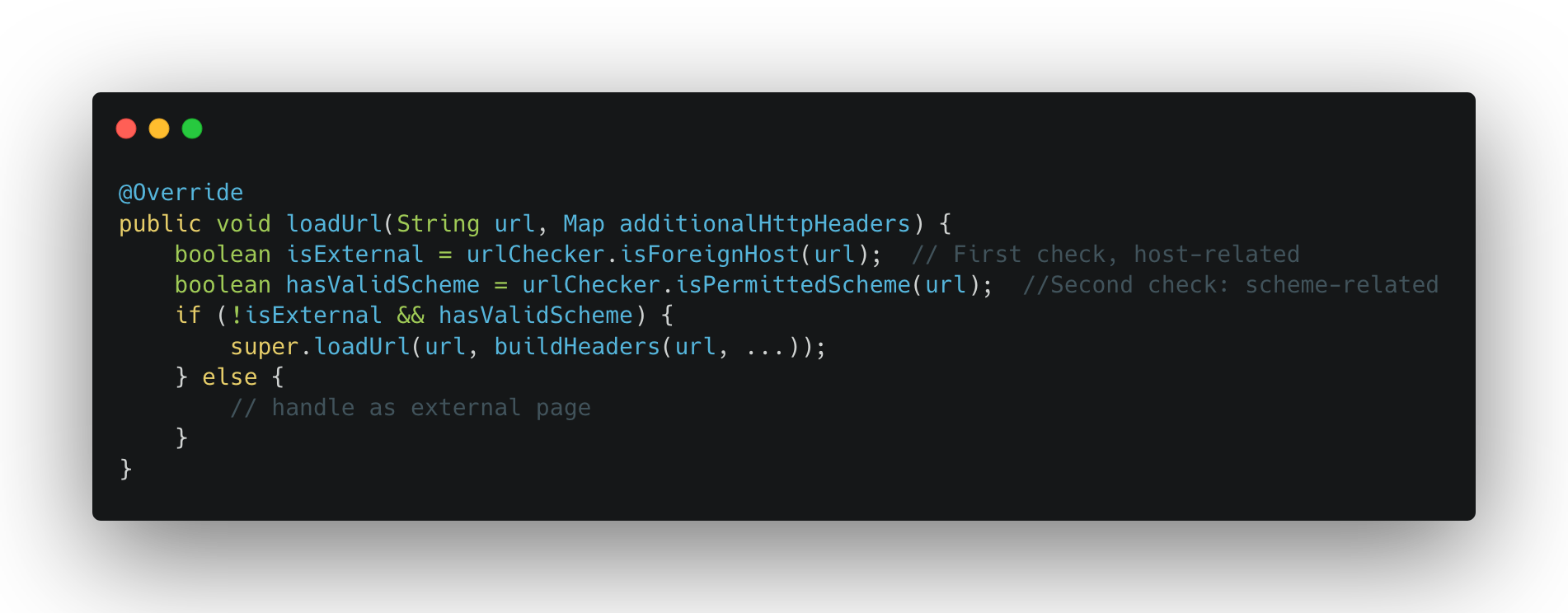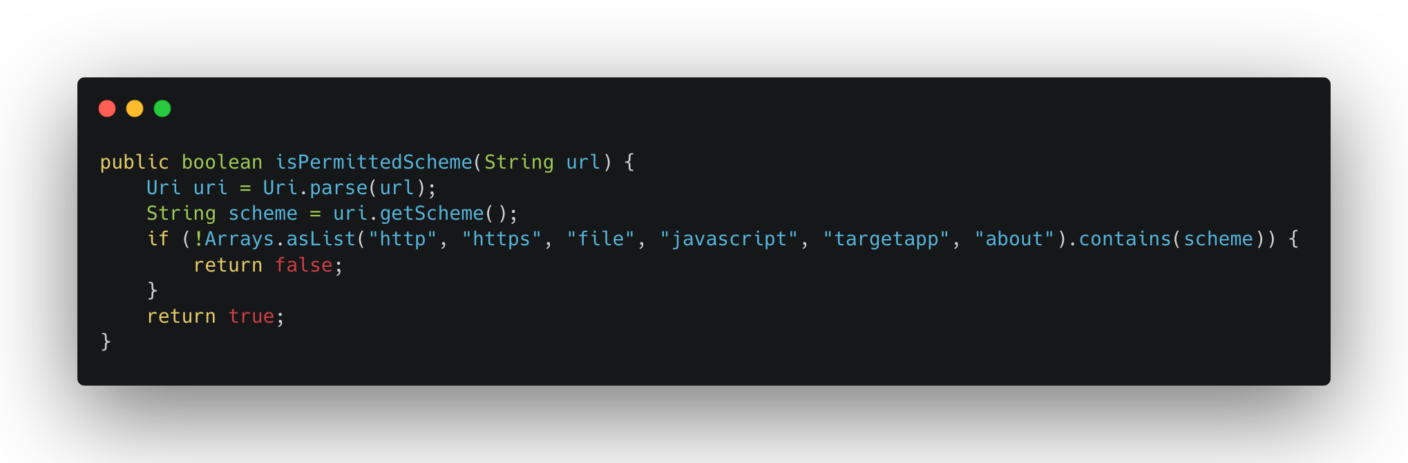 This method only checks whether the host belongs to the app’s domain — but only for http/https URLs. For any other scheme (like javascript:), it returns false immediately. No domain check at all.
