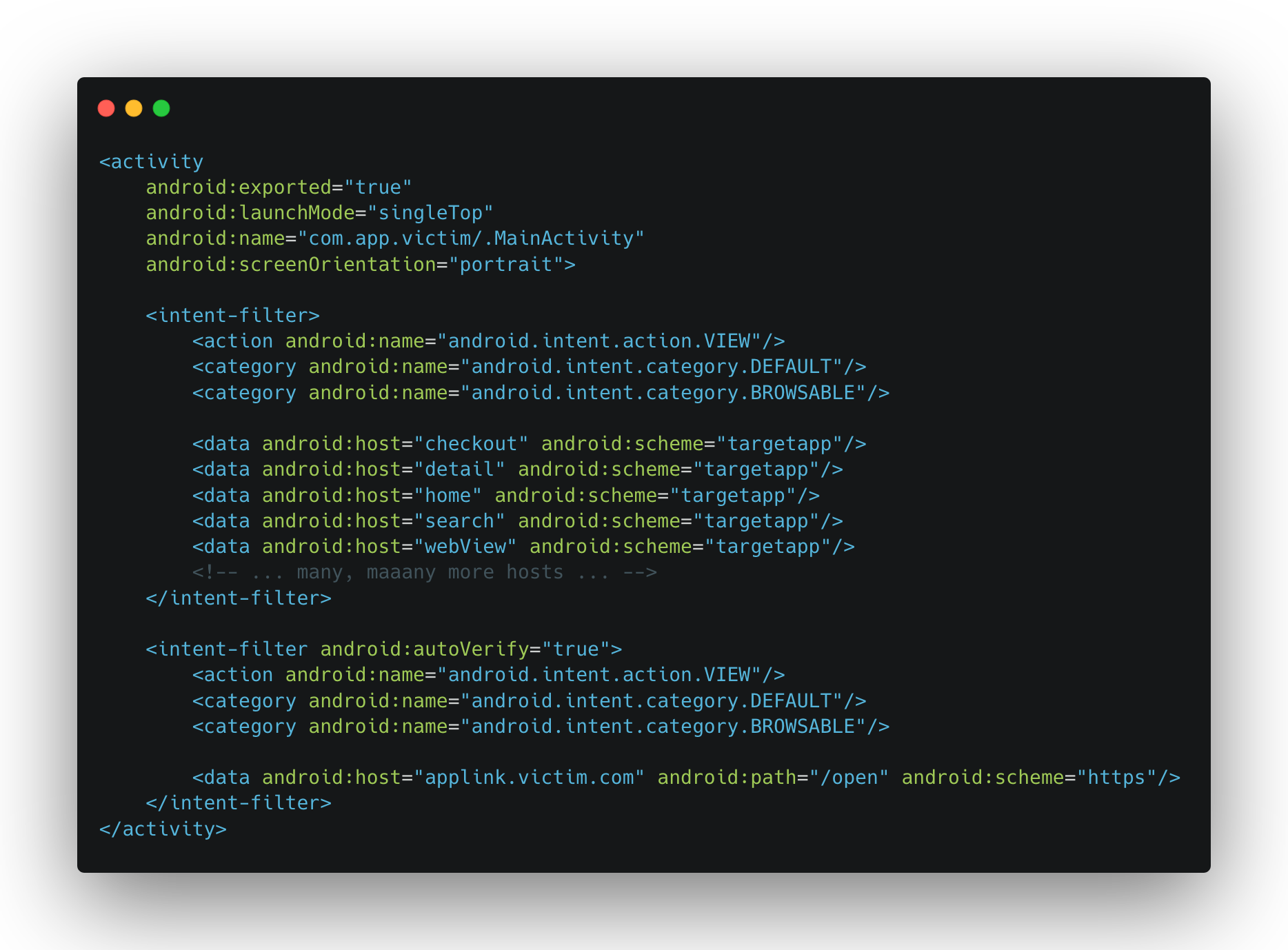 Upon analyzing the app, the first things i looked at were the exported activities and their intent-filters. This app was huge, but it had one activity that handles most of the deeplinks — we’re talking 100+ — so i knew something had to be off. This activity was MainActivity, here’s how it looks in the manifest: